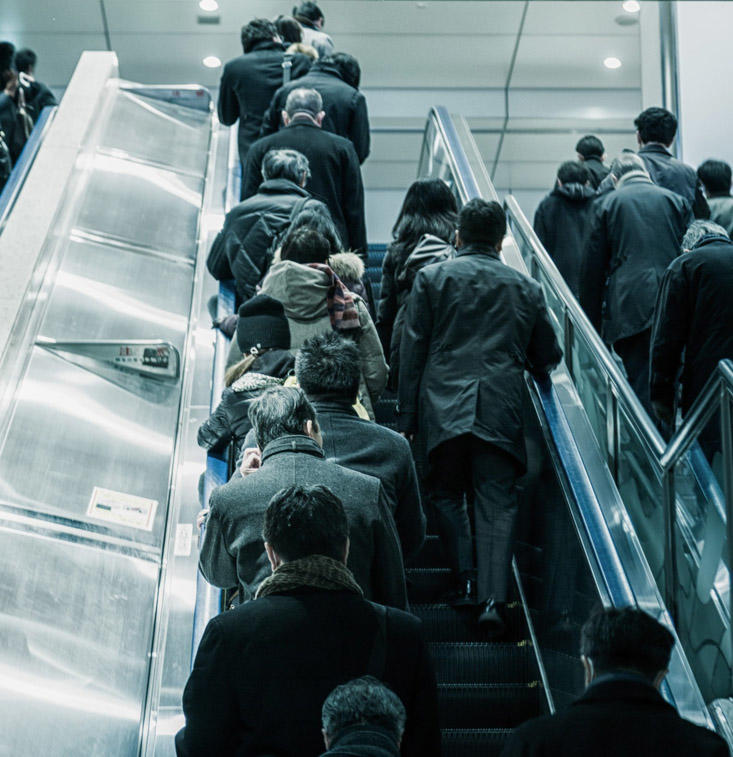 結局のところ、片側空けを解消する方法は、ラッシュ時にはエスカレーターの運行を停止して、左右どちら側も歩いてもらう。残念ながら今のところ、これしかないでしょう。