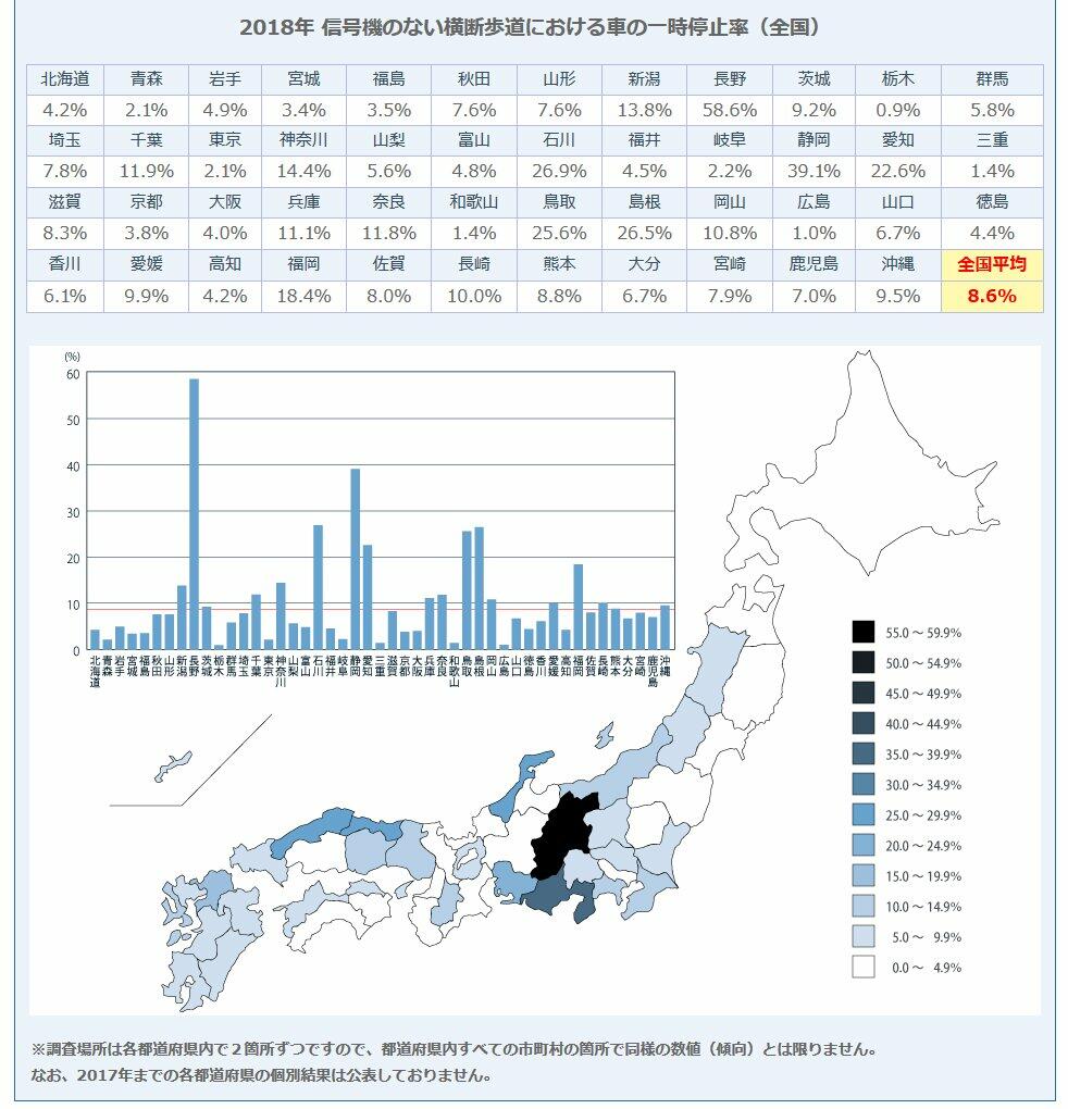 同調査はJAFが2016年から毎年実施しており、2017年には一時停止率が最も高い長野県のみ、県名を公表して紹介していましたが、2018年の調査報告ではこれを全都道府県について公表したのです。