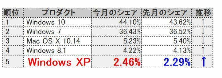 WindowsXP のシェアは2.46%と数字こそ低いものの、MacOS High Sierra(10.13)の2.00%を上回り、第五位にあります。