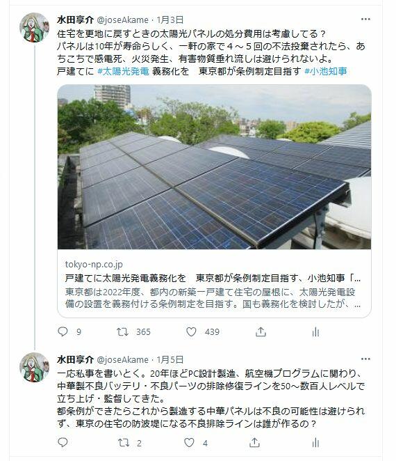 しかし、二酸化炭素排出を減らすためだけの目的で太陽光発電設備を都民に、しかも自己負担で強いるのはやりすぎではないでしょうか。また、都内住宅地に太陽光パネルを敷き詰めて、安全上に問題はないのでしょうか。