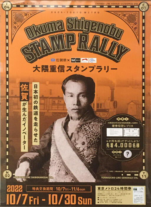 東京メトロと佐賀県は「東京メトロ×佐賀県 大隈重信スタンプラリー」を今月末の2022年10月30日(日)まで実施しています。