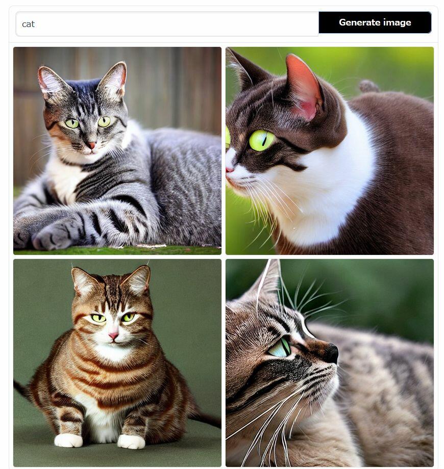 「Enter your prompt」にcat と単語を入れて、「Generate image」のボタンを押すだけで、十数秒後にはリアルな猫とご対面できます。しかも、4タイプも。![]()