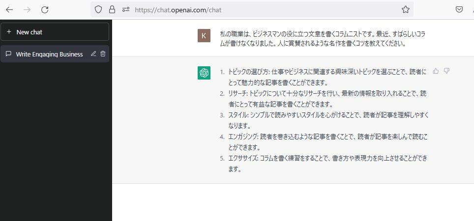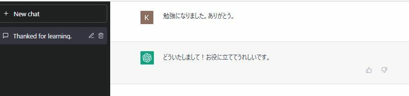 英語を入力する必要はありません。画面下の枠内にカーソルを合わせて、日本語を打ち込むと即座に日本語で返信してきます。内部で英語に自動翻訳しているようで、左側のタブには英語でタイトルが付与されます。