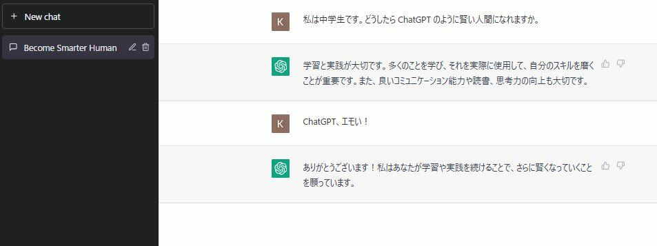 ChatGPT 自身は自分のことをどう思っているのでしょうか。中学生や高校生の振りをしてたずねてみました。![]()