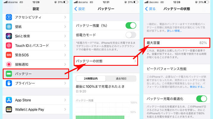 iPhoneを使っている方は、[設定]から[バッテリー]を選択して、[最大容量]を調べてください。