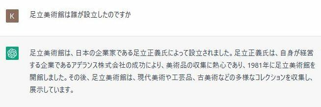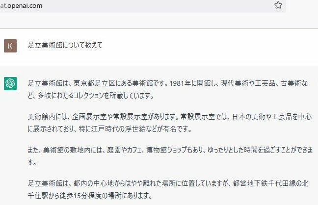 ChatGPT から東京都足立区にあると言われている足立美術館。筆者はこれまで何度もChatGPT に訂正文を読み込ませていますが、いっこうにあらたまる気配がありません。このAIには本当に学習機能があるのでしょうか。もしくは価値のないと判断した情報は、あえて削除しているのでしょうか。![]()