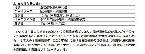 高血圧を予防するため、1日あたりに摂取する食塩の量を現状の10.1グラムから7グラム未満にまで減らすことを目標・・・。