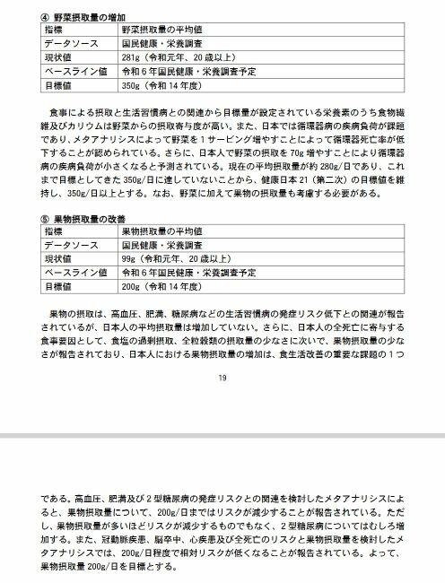 「バランスの良い食事を食べている者の増加」を目標として、「野菜摂取量の増加」、「果物摂取量の改善」、栄養素レベルの「食塩摂取量の減少」を目指す・・・と、健康日本 21(第三次)資料、18~19ページにはあります。