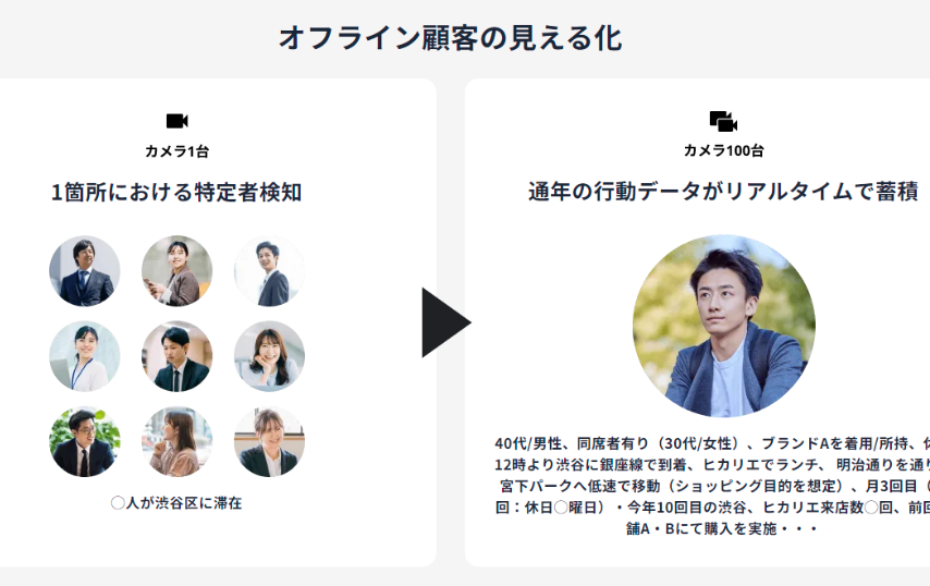 年齢や同伴者、服装、渋谷での行動内容まで、データをリアルタイムで蓄積──渋谷駅周辺にAI100台を設置するプロジェクト「渋谷100台プロジェクト」のWebサイトにある・・・。