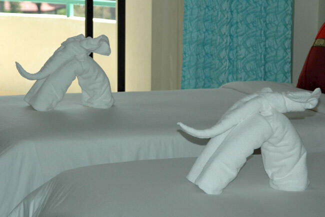※タイ・スリンのホテルのベッドメーキング。スリンはゾウの街(筆者撮影)