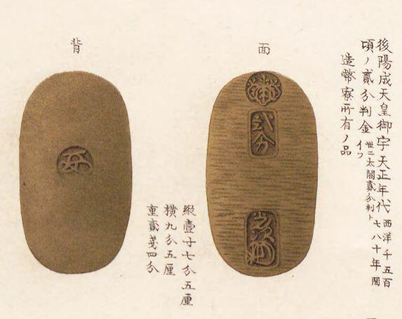 ※天正年代期(1570~80年)弐分判金『大日本貨幣精図』(明治12年刊)[国立国会図書館デジタルコレクション]![]()