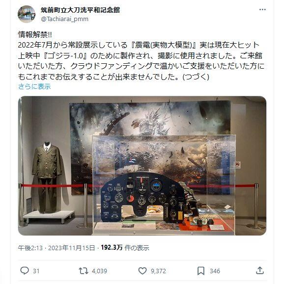 「情報解禁!」という一文で始まるポスト(旧ツイート)で、大刀洗平和記念館が公表したのは、その実物大模型の「震電」が『ゴジラ-1.0』で使われたものだ・・・。