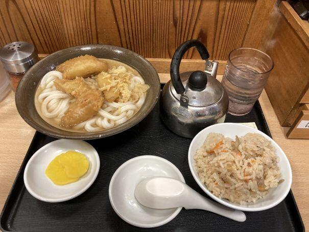 左隣の娘はやかんから何かをレンゲに注いでちびちび飲んでる。右の兄ちゃんは柔うどんにどぼどぼ継ぎ足し。筆者はうどんにかけるとさらにうどんが増えるだけと判断して、かやく飯にかけて茶漬けにしました。