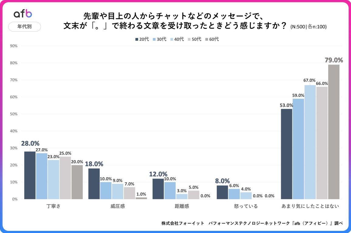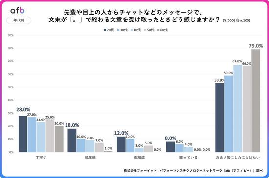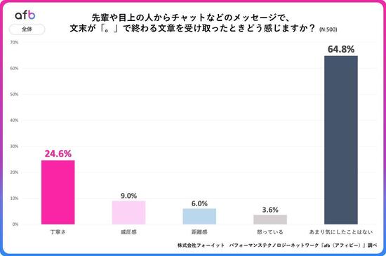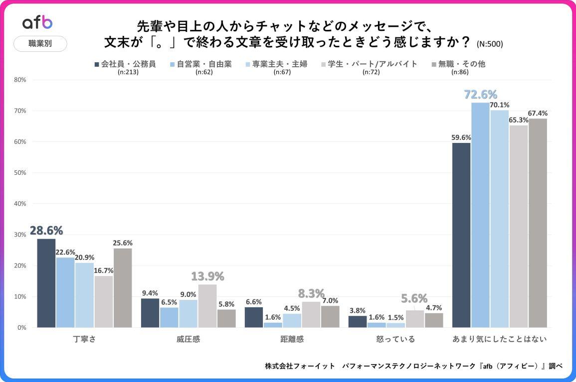 職業別で見ると、文末の「。」に「丁寧さ」を感じている方は会社員・公務員が28.6%・・・「威圧感」や「距離感」などネガティブに感じている方は学生・パート/アルバイトが最も多くなっています。![]()