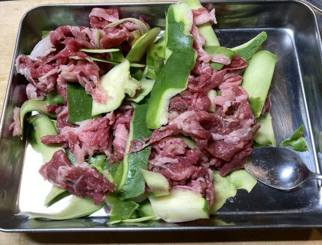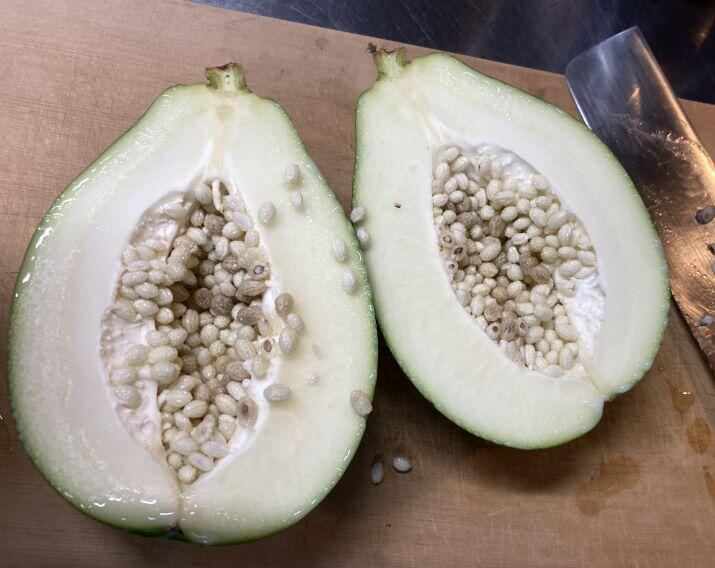 青パパイヤには肉の脂肪やタンパク質を分解する「パパイン酵素」が含まれているので、下処理には手袋が必要です。素手で触ると皮膚がかぶれたりします。![]()