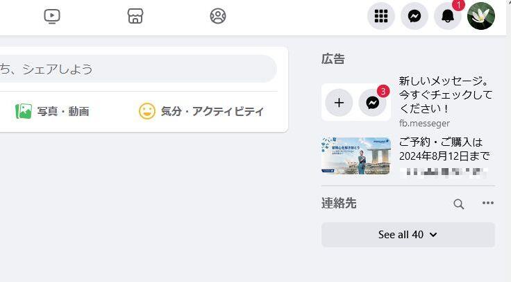 広告画像もFacebookのメッセージ到着サイン(赤丸に白抜き数字)を模倣して画面デザインの均一性があり、悪意と悪質は明白。