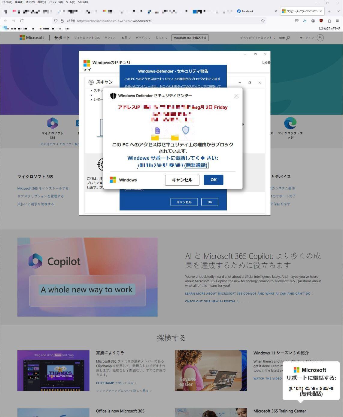 ※突然、Facebook画面を覆い尽くす警告?画面が登場。タブには「コンピューターエラー」とWindowsアイコン