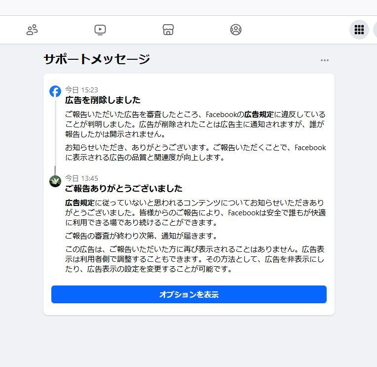 「広告規定にしたがっていないコンテンツ」としてFacebookサポートに連絡しました。