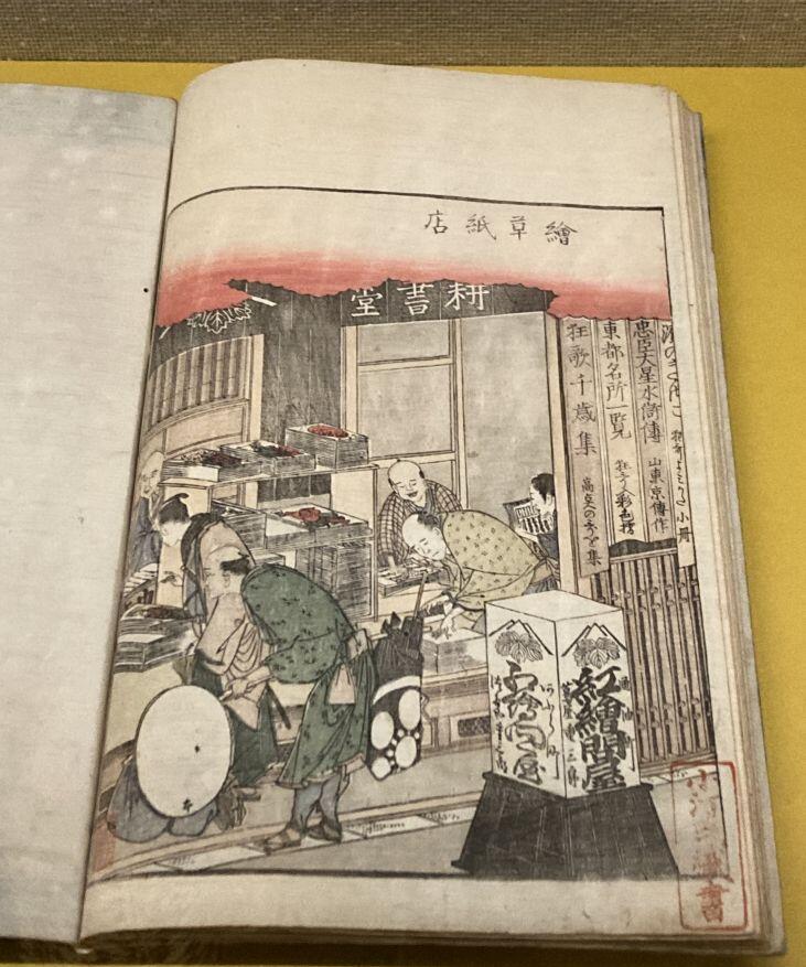 ※北斎が描いた蔦屋の店頭風景。「葛飾北斎『画本東都遊』下 絵草紙店」(通期)※半期で同タイトルの作品に展示替えをします。(すみだ北斎美術館所蔵)
