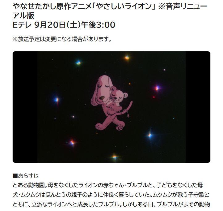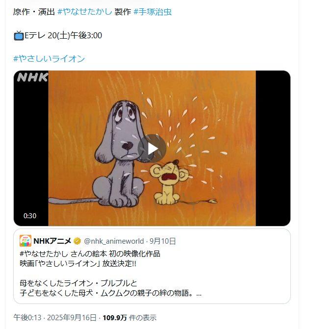 NHKではこのドラマの中で登場した劇場アニメ『やさしいライオン』(原作・演出・美術:やなせたかし)を、明日の9月20日(土)、Eテレにて午後3時から放送します。