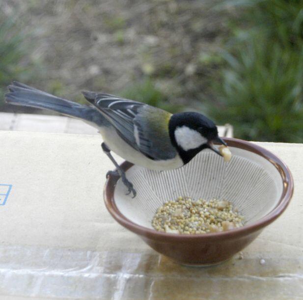 ※粟の中に特大のクルミを見つけて大喜びのシジュウカラ(筆者撮影)