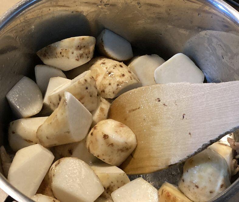 こうすると煮込んだ時に芋のぬめりが出ず、牛肉のうま味がからみつきます![]()