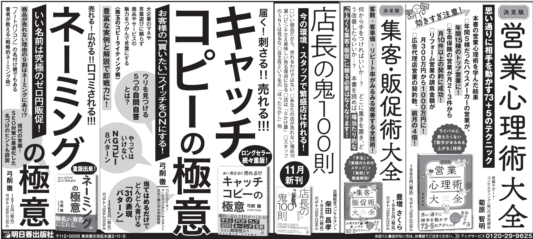 トップページ News 11/24(金)・日経MJに広告が載ります News 2023年11月16日 Tweet 11/24(金)・日経MJに広告が載ります 11月24日(金) ・サイズ:全5段・載る本 「決定版 営業心理術大全」 「決定版 集客・販促術大全」 「店長の鬼100則」 「届く!刺さる!!売れる!!! キャッチコピーの極意」 「売れる!広がる!!口コミされる!!! ネーミングの極意」 < 前の記事 > 次の記事